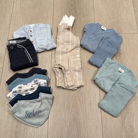 Klespakke i str 56 fra Newbie og Name it. En bukse i str 50, men er stor i str.