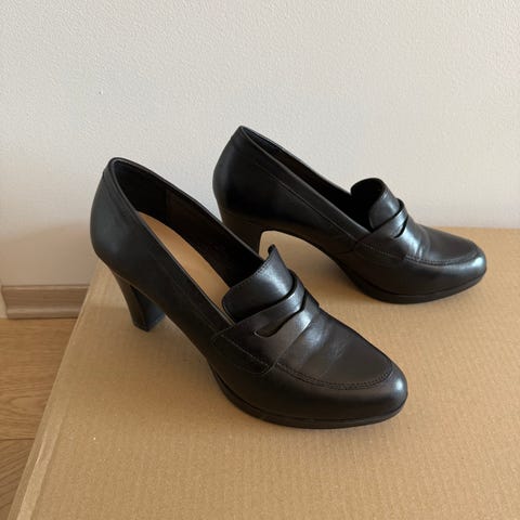 Brukt kun et par ganger, ingen slitasje. Ekte skinn både innvendig og utvendig, innersålen måler ca. 25 cm. Tilsvarer størrelse 40, vil jeg si. Kule og stødige pumps med litt platå