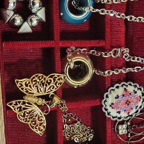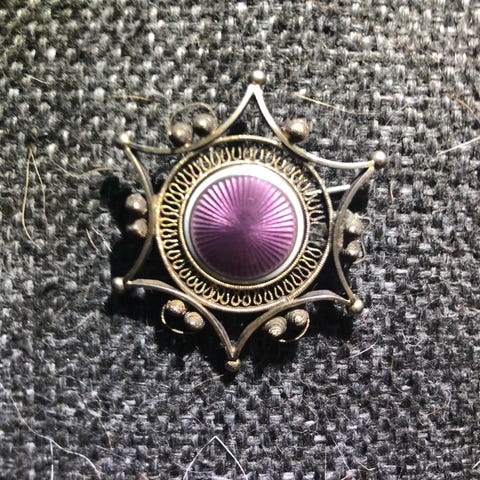 Forskjellige sølv/ emalje smykker kniver selges. Er også noe smykker i bronse.