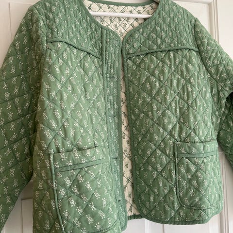 Nydelig og moderne sett med quilted jakke og tynne lette bukser. Kjøpt i dansk designerbutikk. Vil si at str er s/m. Buksene har strikk i livet så de kan passe alt fra S til liten L, og jakken er også romslig, men ganske rett. Den er nett over bysten og gir derfor et slankende inntrykk. Begge kan vaskes. Brukt en gang.