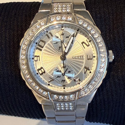 GUESS W0017L1 dameklokke med kronograf funksjon. Klokken trenger batteri og reima har flasset av litt, og bør skiftes. 400,- Gratis frakt.