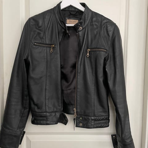 Pent brukt foret lærjakke som lukkes med trykknapper. Har to lommer. Den ene lommen hadde en liten åpning inni som jeg reparerte/ sydde igjen.
