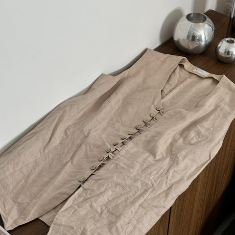 Lite brukt vest i linblanding, str.38, kr.200. Vesten lukkes med perlemorsknapper.