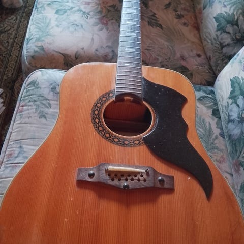 Gitaren er kjøpt over mange år siden som brukt. Og det har stått som pynt hos oss.