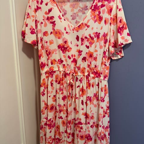 Nydelig kjole i freshe farger. Korte sommerfugl ermer og volanger nederst. Like fin til hverdags som til fest. Kjøpte den selv på Finn, men den ble dessverre litt knapp. Vil si den er M-liten L.