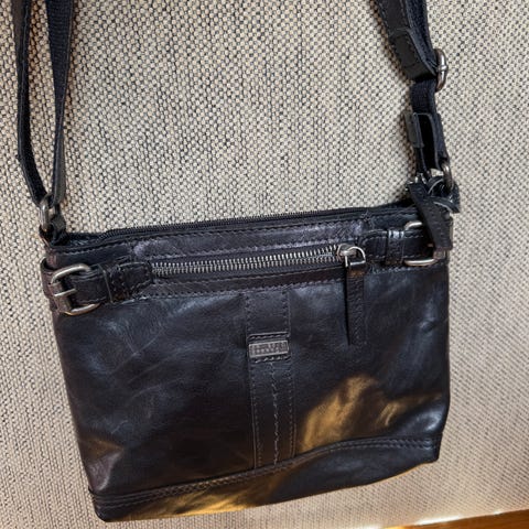 Mørk bruk skinn/ lærsekk fra Spike & Sparrow. Svært lite brukt. Ingen rifter eller skader. En gludelåslomme og lomme til mobil og penner på innsiden. En lomme i fronten utenpå og to sidelommer. En glidelåslomme bak.