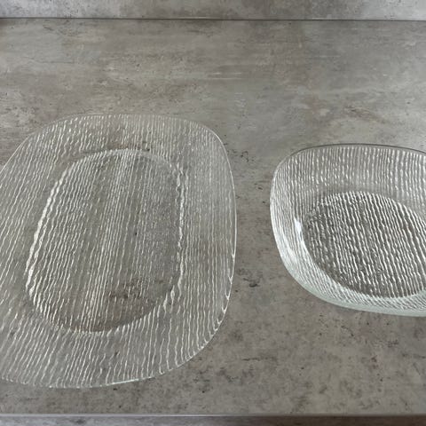 Klart glasfat, som er delt i 2. 25 cm langt, 15 cm bredt