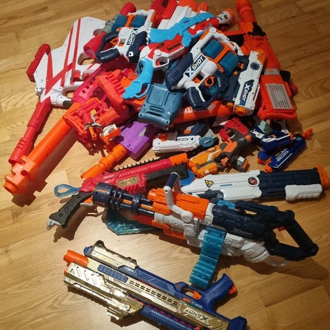 Selger en pent brukt Nerf med 12 piler. Batteri følger med men er brukt.