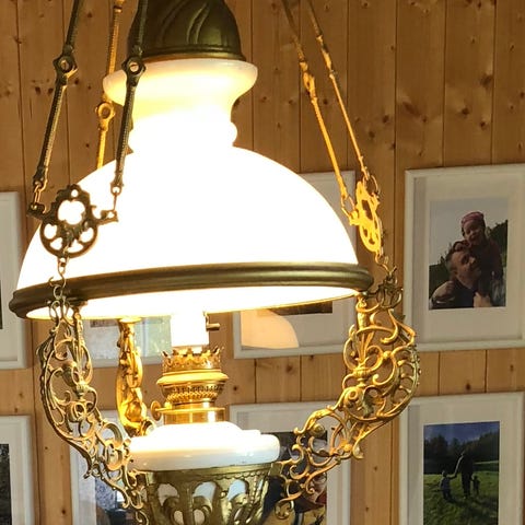 Fin taklampe, mangler glasset rundt brennere. Parafinnbrenner følger med. Må hentes.