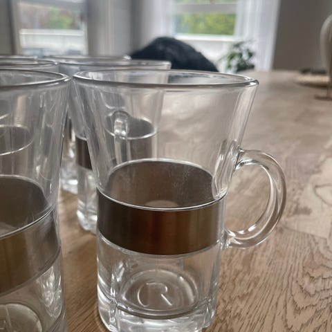 6 stk kaffe glass lite brukt. Ene mangler metall ring rundt glasset (som vist på bilde)