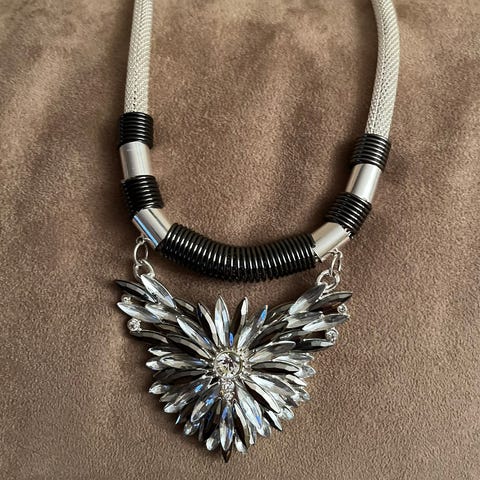Et vakkert halskjede / statement smykke med sorte blomster og glitrende steiner, med bling-effekt, blikkfang til antrekket. Perfekt for å pynte opp hverdagsantrekket til kvinne/dame/jente eller for å skape en spesiell look til ferie- og festantrekket.