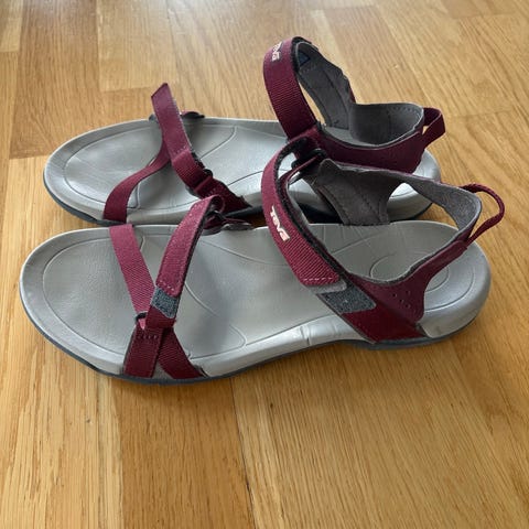 Søte og sporty sandaler i burgunder/brun farge. Reimene er av lær og kunstmareriale. Kun brukt innendørs.