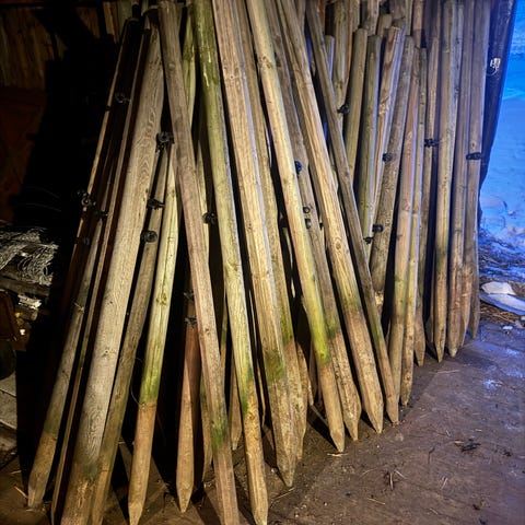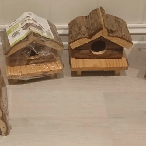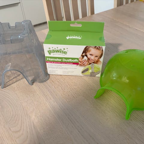 Lite hamsterhus, halm (2/3 igjen av posen) og papirbasert bunnstrø (1/4 igjen av posen).