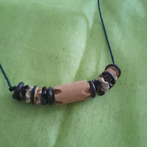 Håndlaget henge ørepynt i tre og stein. Brun og grønn. Unike. Kan sendes med posten på billigste måte som brevpost til 46kr