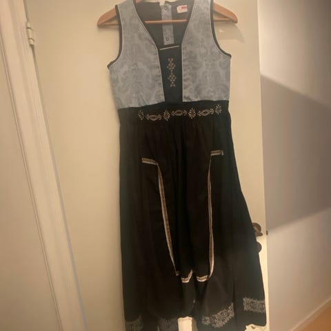 Flott bunad/festdrakt til jente i blåfarge. Denne kan brukes i flere år. Med enkel broderi. Det er biser helt nederst som gjør det lett å justere på lengden.