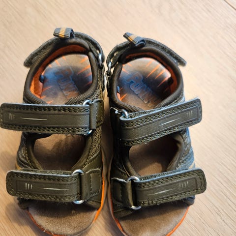Noe bruksmerker på nederste borrelås, ellers er sandalene pent brukt av ett barn.