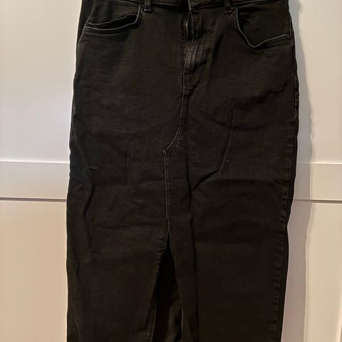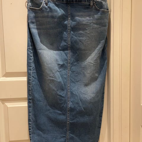 Fotsidt jeansskjørt med splitter, str XL, normalt i størrelse, selges Kr 250,- kjøper betaler frakt