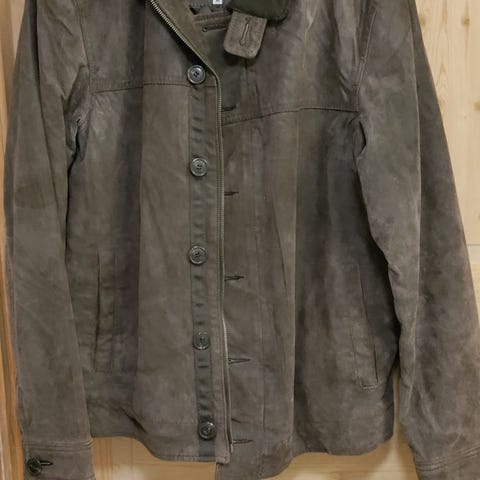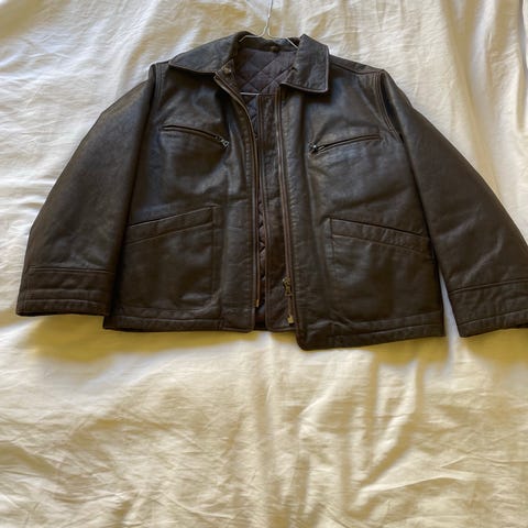 Brun skinnjakke av ukjent merke og eksakt størrelse.