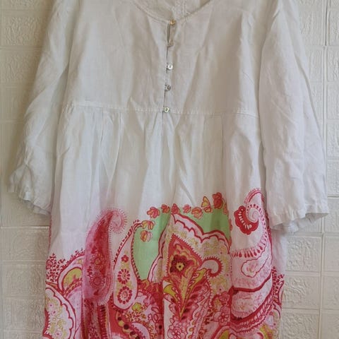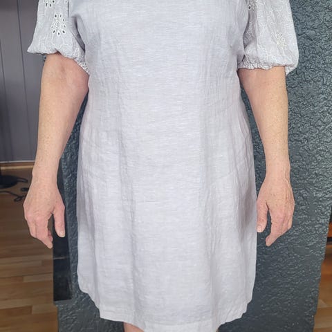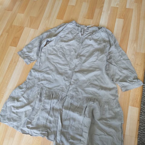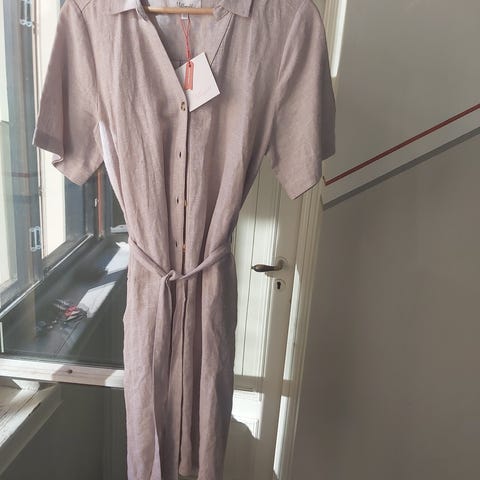 Kjolen er 100% lin og er meget flott i snittet. Kneppet foran og den har en liten splitt I hver side.. Flott både m og uten belte.