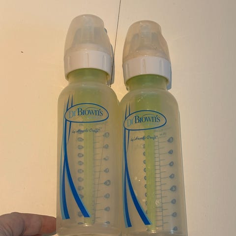 3 antikolikkflasker fra Dr. Brown’s med ekstra tåter. Melkebeholder fra Sterifeed.com og ubrukt smokk fra Dr. Brown’s