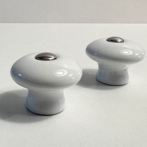 Dørknotter/ møbelknotter i porselen med skruer. Diameter i front ca 4 cm. Dybde 3 cm