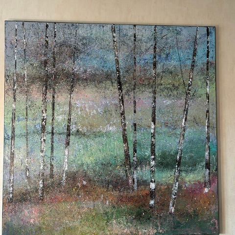 Det er et håndmalt kunstverk, men vi er usikre på hvem som har malt det. Likevel er det et flott blikkfang og et spennende samtaleemne i ethvert rom.