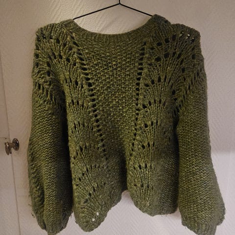 Brystmål ca. 100 cm, 66 lang. Strikket i alpakka ull