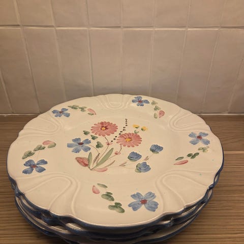 Sjarmerende håndmalt blå- og hvit stripete stort serveringsfat i glasert porselen på diameter 29,5 cm. Produsert i Italia. Pent brukt, men oppdaget et lite skår på kanten (se siste bilde), derav fin pris. Selger også stor skål i samme serie for samme pris, se: