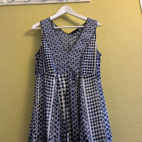Behagelig søt sommerkjole,omtrent ikke brukt,funker både i byen og på stranden.Bomullsstoff,blå og hvit
