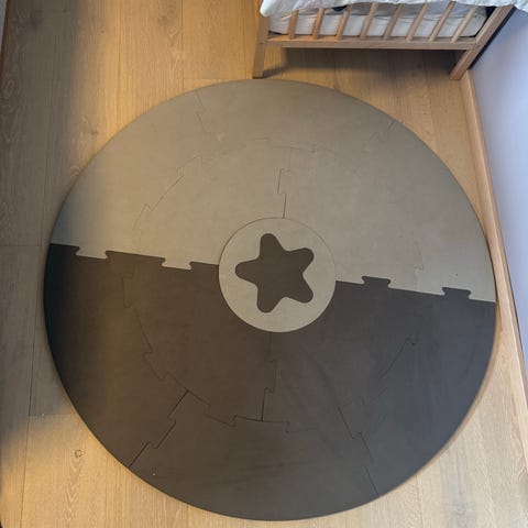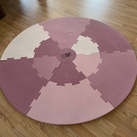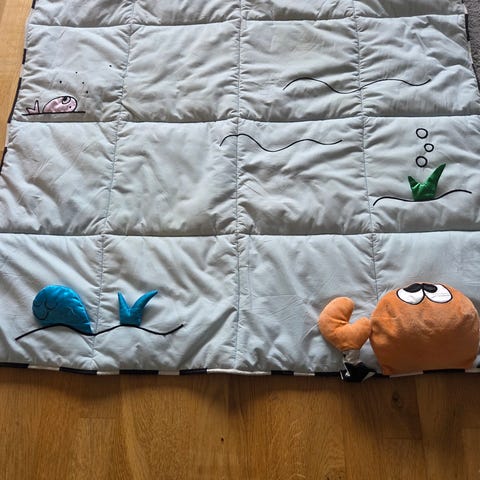 Elodie lekematte/teppe i fargen tender blue. Kjøpt i 2025 på Babycare. Har hatt babygymmen oppå lekematten for å gjøre det mykere for babyen.
