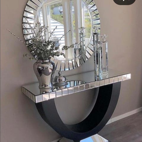 Har en skade nederst bak som kan dekkes når den lenes inntil en vegg.