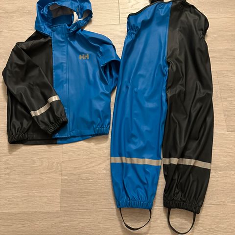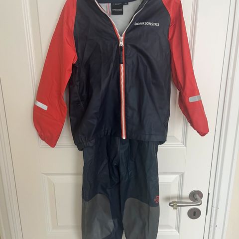 Selger en Didriksons Galon regndress bestående av jakke og bukse. Se bilde. Det er et lite hull på buksa som har blitt limt. Bukseselene er noe slitt, men fungerer. Begge fotstrikkene er der. Dressen er brukt, men det er mye bruk igjen!