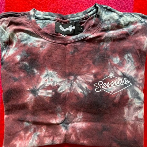 SESSION T-skjorte i strr. XXL med trykk i mørk farge på framsiden selges. Den er godt brukt, men hel og fin.