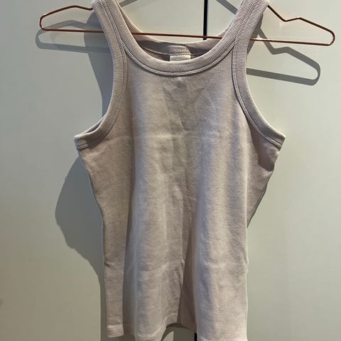 Ribbestrikket topp med striper fra H&M. Str. S. Avrundet halsåpning og rygg med halvtykke stropper. Noe kortere passform. Svart og hvit.