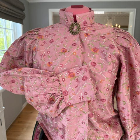 Stakken er i et nydelig brokadestoff og vesten er i brodert bomull og brokade, den er foret med bomull.