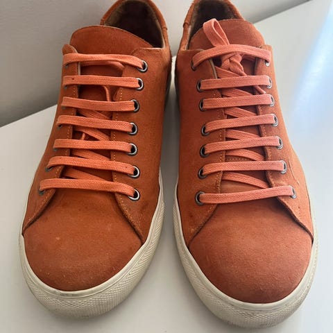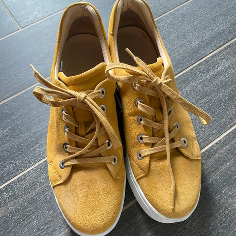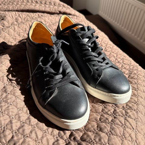 Vakre skinn joggesko. Jeg kjøpte de på tisa nye og de viste seg dessverre å være for små. Det står på dem at de er størrelse 41 men det er en modell som har liten størrelse. På produsentens hjemmeside står det at størrelsen er liten. Så de passet perfekt på en fot i størrelse 40. De ble kun prøvd på. Dette er et selskap som lager sko av etisk produsert skinn. du kan lese mer her: