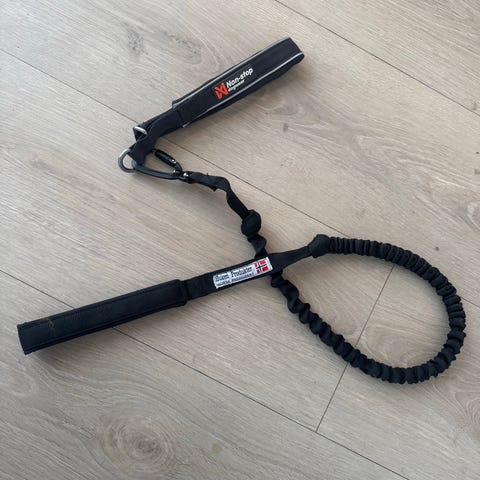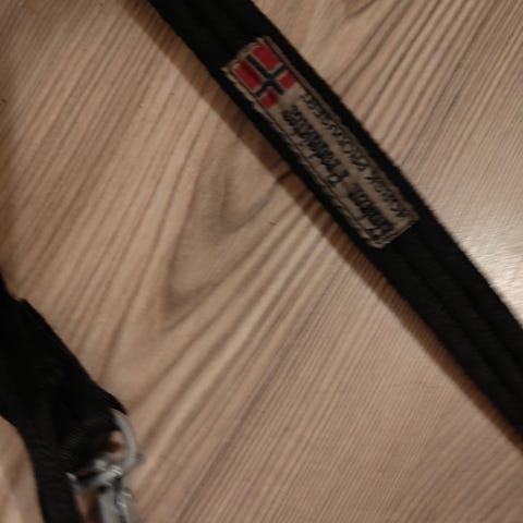 Helt nytt Huken produkter bånd i sort. Solid svart norsk produsert bånd med polstret håndtak og solid twistlås. Måler 100 cm uten håndtak når det ikke er strekt.