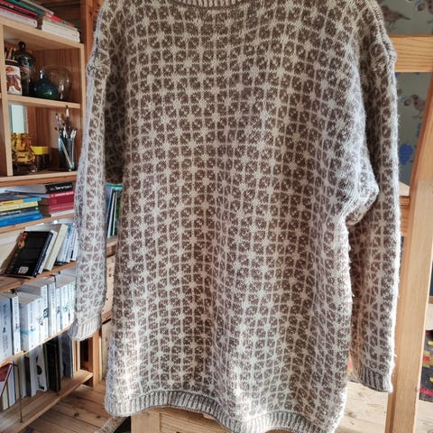 Tykk strikka ullgenser i ull, made in Denmark. Fra det danske merket People. 100% ull. Flott mønster. Varm og god! Herrestørrelse large, romslig. I god stand! Litt nupper.