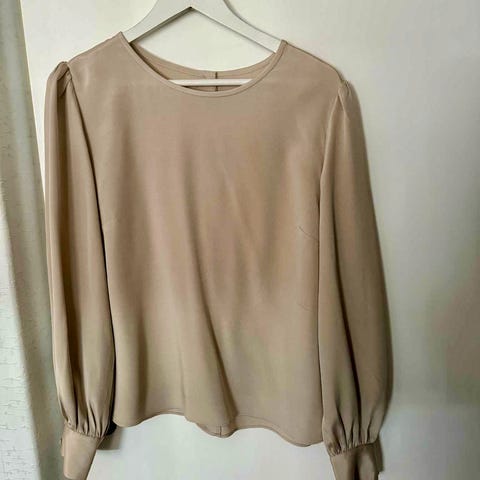 Nydelig beige bluse/ topp fra Garry Weber. Blusen har rund hals og pene detaljer på skuldrene med legg. Lapp klippet av, men ca. str. 38. Måler ca. 50 cm tvers over fra søm under arm til søm under arm. Pent brukt.