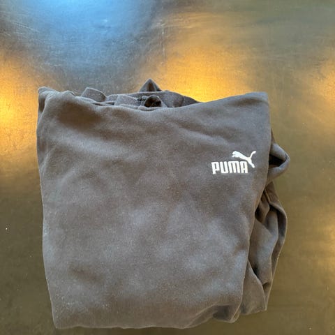 Puma hettegenser / hoodie med hvit og rød logo. Lomme på magen. 100% bomull. Hel og pent brukt, og med litt falmet sortfarge. Størrelse XL, men den har krympet litt i vask, så den passer best til størrelse L.