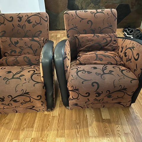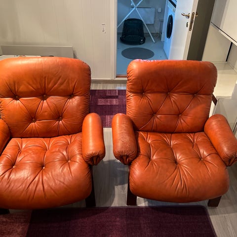 To enkle stoler og en toseter sofa. Merket noe av tidens tann.