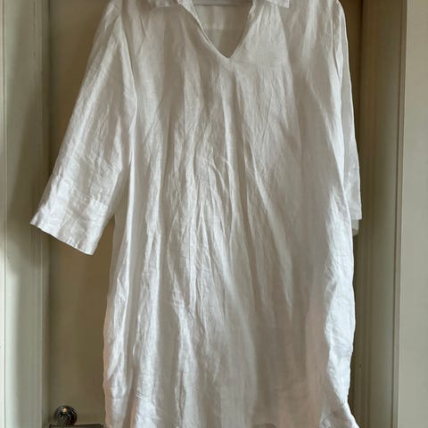 Selger en helt ny og ubrukt, kremhvit kjole fra HM i str. S (M). Kjole. Er rett/løs i fasongen og passer også M. Den er lang, har lange, fine ballongermer, v-hals, liten drapering i front, splitter i sidene og en liten krage. Blanding av polyester og viskose. Kostet 300,-.