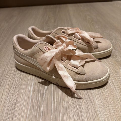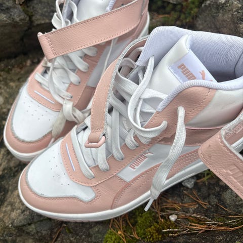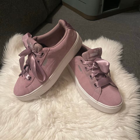 Lyserosa sko i stoff med snøring fra Puma. Størrelse 40. Eco OrthoLite, se bilder for detaljer om materialer. Original oppbevaringspose følger med. Skoene er brukt max et par ganger, har vasket av dem og det er knapt synlig☺️