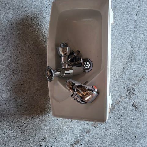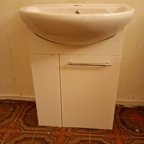 Porselenvasken er 15 cm dyp i kummen. 41 cm bred og 25 cm lang.