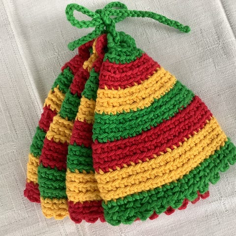 Disse er nye og ubrukte, heklet i bommulsgarn.