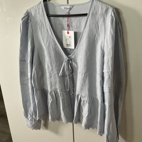 Fin bluse i 87% tencel, 8% lin og 5% terylene. Kan vaskes i maskin på 30 grader.