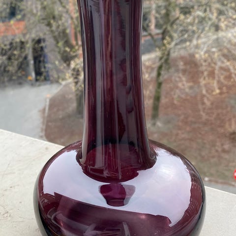 Veldig fin, elegant og stor vase laget av rød glass. Vasen er en praktisk beholder for å vise frem dine favoritte blomster, men også et kunstverk i seg selv. Gir rommet ditt varme og karakter. Flott som en dekorativ gjenstand på en hylle, et bord eller i vinduskarmen.