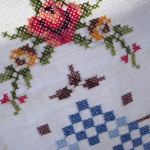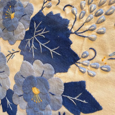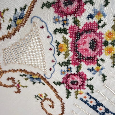 Stor vintage bomulls duk med broderier og blondekant.