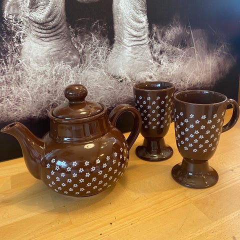 Retro Sødahl. I serien Forglemmeiei. Kanne, 6 kopper med asjett. Salt og pepperbøsse.