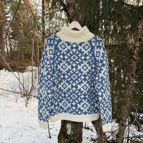Nystrikket Polarnatt Genser i pastellfarger str M. Strikket i Viking Snorre 100% Highland Merino garn. Farger er natur 202, rosa 263, turkis 221, lavendel 267 og mørk rosa 261.